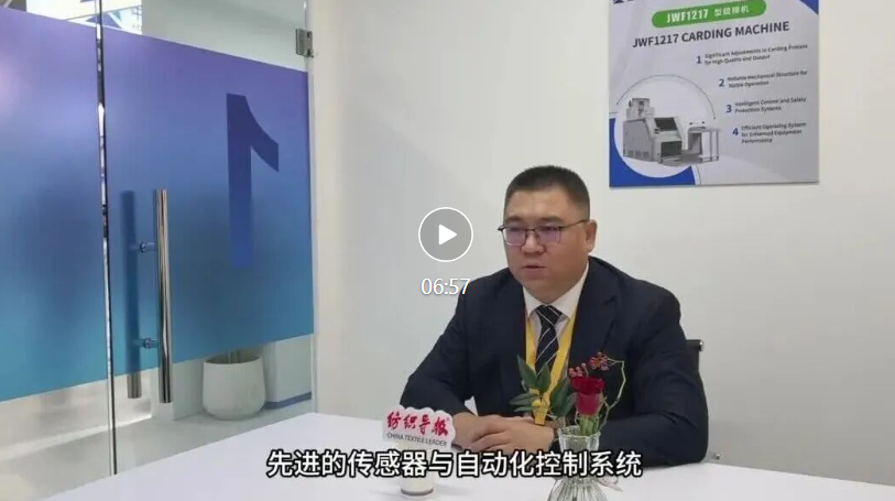 青岛宏大集中展示了覆盖纺纱全流程关键环节的前沿技术方案,以JWF1217梳棉机、VCRO PLUS自动络筒机及多组分智能精细混开棉机组系列的3D视频,为观众带来沉浸式观展体验。青岛宏大纺织机械有限责任公司副总经理孙晓山现场介绍了企业的亮点产品、经营情况以及未来产品布局。