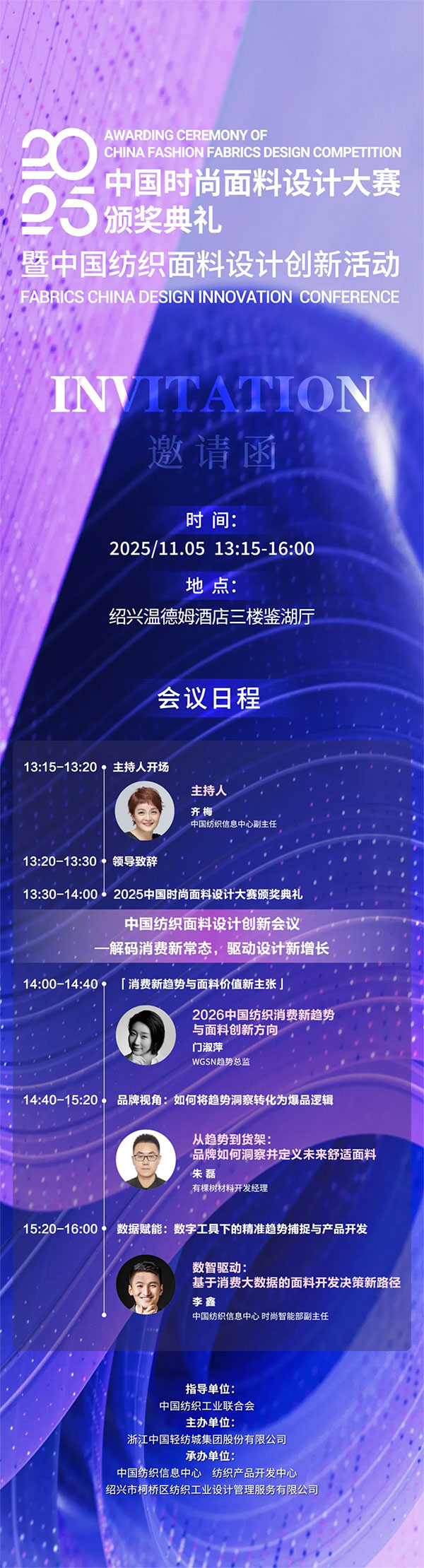 在设计端,数字化决策体系正高效赋能产品开发;在消费端,绿色可持续与功能场景化需求正在成为市场主流。如今的面料设计,已跳出生产开发的单一维度,成为契合消费市场需求、助力品牌焕新的关键引擎,持续驱动着行业的创新与转型。为进一步激发设计活力、汇聚产业智慧,2025中国时尚面料设计大赛颁奖典礼暨中国纺织面料设计创新活动将于11月5日在绍兴柯桥举行。