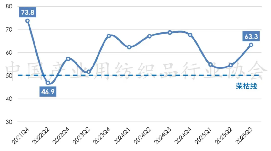 2025年前三季度,全球经济复苏乏力、地缘政治冲突持续、主要经济体货币政策不确定性犹存;我国经济运行保持稳中有进态势,高质量发展取得积极成效。面对复杂严峻的外部环境,我国产业用纺织品行业经济运行总体保持平稳,行业的生产、经济效益指标增速有所放缓,出口呈现温和回暖趋势。根据中国产业用纺织品行业协会调研,2025年前三季度我国产业用纺织品行业景气指数为63.3,较上半年提升8.7个点(图1)。