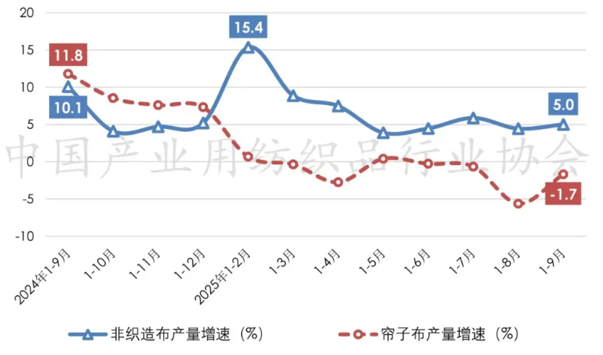 自2025年以来,我国非织造布产量呈现出“高开、回落、趋稳”走势,根据国家统计局数据,2025年1-9月规模以上企业的非织造布产量同比增长5%,月均产量较二季度提升12.2%。帘子布市场需求放缓,产量整体处于负增长区间,1-9月规模以上企业的帘子布产量同比下降1.7%(图2)。