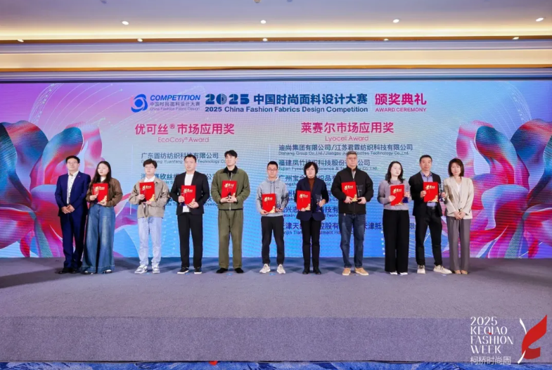 中国时尚面料设计大赛今年再度与赛得利集团携手,将环保理念深植企业基因,持续引领下游企业绿色升级。在11月5日举办的2025中国时尚面料设计大赛颁奖典礼上,来自迪尚集团有限公司&江苏君霖纺织科技有限公司、福建凤竹纺织科技股份有限公司、广州宝合笠纺织品有限公司、绍兴志旭纺织科技有限公司、杭州梢嘿贸易有限公司、天津天纺投资控股有限公司&天津抵羊智造有限公司的产品获得“莱赛尔市场应用奖”,来自浙江美欣达纺织印染科技有限公司、浙江嘉欣丝绸股份有限公司、广东圆纺纺织科技有限公司的产品获得“优可丝®市场应用奖”。这些面料均充分挖掘了莱赛尔和优可丝®的产品优势,色彩丰富,设计感强,在保证面料舒适亲肤的触感下,提高了时尚设计感,满足了消费者对面料的需求。