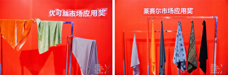 在柯桥时尚周期间举办的2025柯桥时尚设计展(秋季)上,特别展示了本届大赛荣获“莱赛尔市场应用奖”和“优可丝®市场应用奖”的产品。