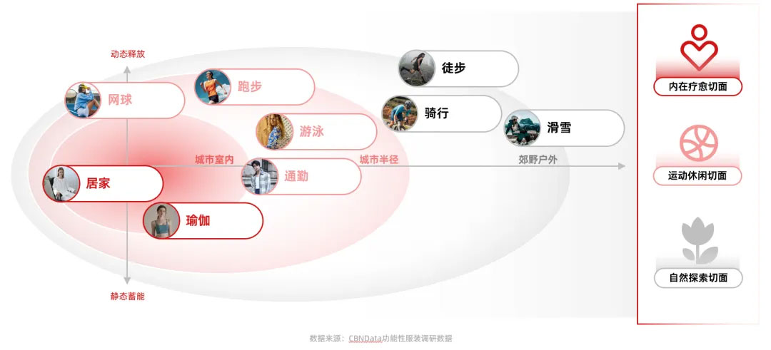 伴随着运动场景的拓展,功能性服饰也进一步垂直细分,以适应不同场景的着装需要。将这些场景细分归类,沿着「内在疗愈」、「运动休闲」、「自然探索」三条主线,从居家、瑜伽、跑步、网球、游泳、徒步、骑行、滑雪等九大场景入手,能更清晰地描绘出功能性服饰的应用场景地图。