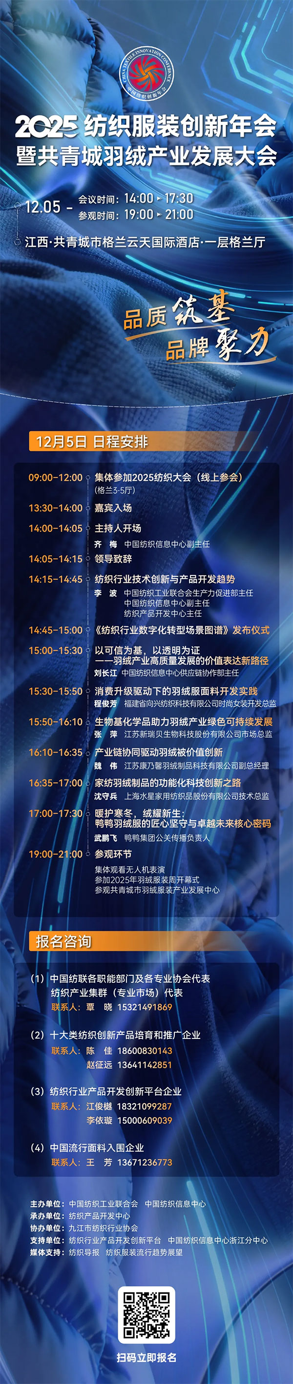 当下,消费升级浪潮涌动、双碳目标深入推进、全球供应链加速重构,羽绒产业既面临原料升级、标准迭代的挑战,也拥有技术创新、集群赋能的机遇。本次大会将立足产业发展新形势,聚焦羽绒制品质量标准升级、绿色环保材料创新应用、终端产品设计创新等前沿议题,精准解读羽绒行业的未来发展趋势与核心增长点,助力中国羽绒服产业在全球赛道上持续领跑。