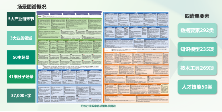 该图谱全面覆盖纺织产业链的研发设计、生产制造、经营管理三大业务领域,系统梳理出50个主场景和41个细分场景,每个场景均包含现状评级、数据要素、知识模型、技术工具、人才技能及痛点问题关键要素,为行业制定标准和推进应用落地提供了权威的理论基础和方法,使纺织服装企业的数字化转型之路更清晰、更高效。