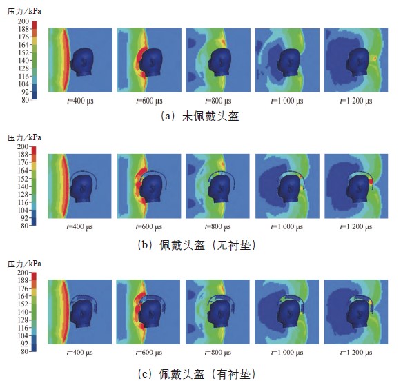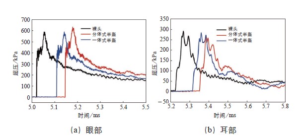 近年来,学者们通过以上方法对军用头盔的爆炸冲击波防护性能进行了研究。国内方面,张文超等基于ACH头盔进行建模,采用LS-DYNA软件模拟爆炸冲击波作用头部空气流场压力云图,结果显示,佩戴头盔可有效削弱前额、颅顶冲击波超压;因冲击波在头-头盔发生反射、透射与绕流,“过冲效应”使得颅后超压高于未佩戴头盔,冲击波正压作用时间增长;头盔的衬垫可减弱头盔对颅后防护产生超压增强的负面影响(图1)。结合ACH头盔外壳,贾时雨等采用海绵与聚脲-聚氨酯泡沫复合材料设计多种环形外沿内衬,通过激波管及外场爆炸实验表明,加装环形衬垫可使进入ACH头盔内部的冲击波压力有效衰减,且头盔与头部间隙越小,防护效果越好。康越等通过激波管测试对比裸头模与佩戴分体式/一体式半盔的情况,发现眼与耳因结构特殊易受冲击波靶向攻击(图2)。冲击波叠加汇聚会对眼与耳造成挤压与拉伸损伤,因此需加强头盔对眼与耳的防护。伍杨等通过爆炸实验评估FAST头盔及其加装防护面罩对爆炸冲击波的防护效果。实验中,1 号传感器置于参照靶标前额,2、3、4 号传感器分别置于测试靶标的前额、颅顶与颅后,结果显示,加装面罩可显著降低冲击波对前额和面部的伤害(图3)。
