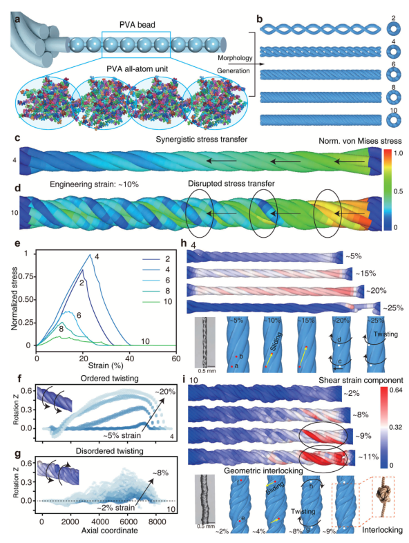 为揭示扭转增强机理,研究团队建立了基于耗散粒子动力学的多尺度计算框架(图4a),通过Python算法构建精确的螺旋结构模型(图4b)。模拟结果表明,4股纤维在约10%工程应变下呈现最优轴向应力传递(图4c),而过度扭转(10股)会导致应力分布紊乱(图4d)。几何分析显示,4股纤维在5%-20%应变范围内旋转矢量的z分量均匀增加(图4f),表明截面协同旋转;而10股纤维在2%-8%应变区间z分量交替变化(图4g),出现反向旋转失效机制。剪切应变表征证实,4股体系在5%-25%应变范围内保持均匀分布(图4h),通过纤维间滑移和扭转耗散能量;10股体系则在约9%应变处出现局部剪切集中(图4i),最终导致几何锁死和打结现象。