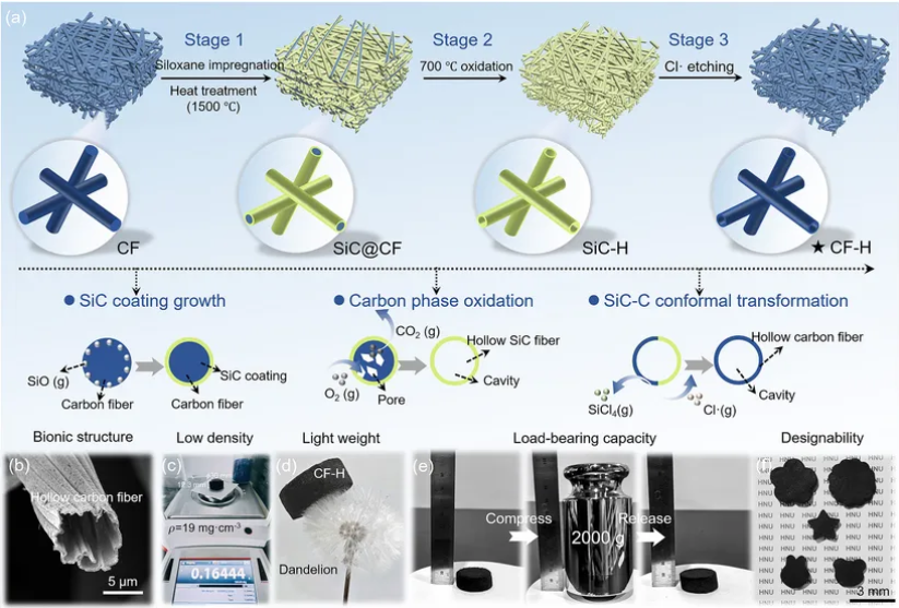该材料的制备分三步完成:先让碳纤维毡裹上硅氧烷干凝胶层,经1500℃热处理形成碳化硅包覆的碳纤维毡(SiC@CF);再在700℃下氧化,选择性去除碳芯,得到中空碳化硅纤维毡(SiC-H);最后用CDC策略,通过氯自由基蚀刻SiC-H,最终形成CF-H。
