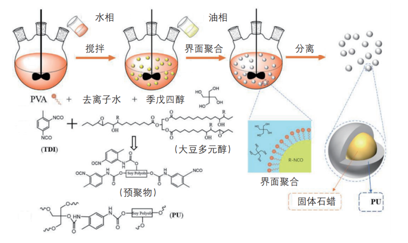 可降解合成高分子材料的可选择性较少,以生物基材料为反应单体构建不可降解合成高分子材料囊壁如生物基聚氨酯、生物基丙烯酸酯、生物基环氧树脂和生物基聚脲树脂等的研究得到广泛关注。植物油基多元醇多被用于生物基聚氨酯囊壁的构建,闫佳辉以生物基大豆油多元醇为原料,对甲苯二异氰酸酯(TDI)进行改性形成预缩物,进而通过界面聚合法制备了相变微胶囊。