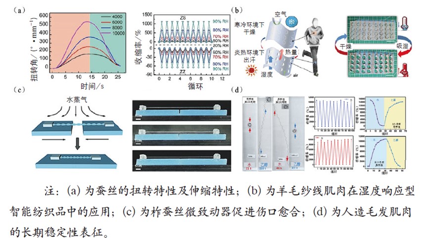 以蚕丝和羊毛为代表的蛋白质纤维,其复杂的三维结构由二硫键等化学键维系,赋予了这类材料优异的力学性能与独特的湿度响应特性。蚕丝的主要成分为丝素蛋白,可通过脱胶、加捻等工艺开发出应变输出优异的湿驱动人工肌肉。羊毛中的角蛋白则凭借大量二硫键与α-螺旋结构,表现出良好的弹性与韧性;独特的鳞片结构和二硫键网络使其具有显著的湿度响应特性,并通过氢键的非对称破坏实现单向扭转,经亲水改性后扭转性能与循环稳定性更为突出。