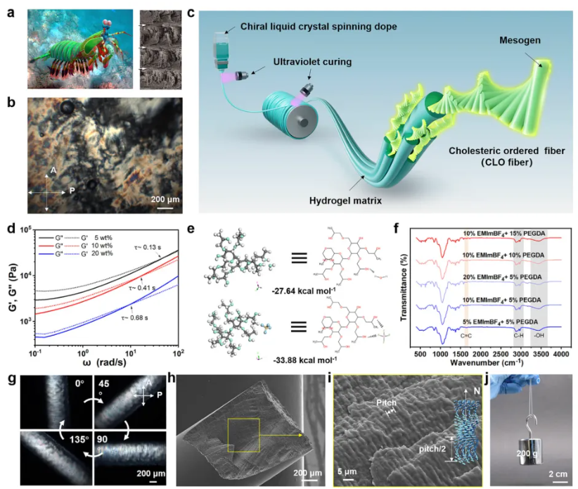 研究的核心在于对羟丙基纤维素(HPC)液晶态前驱体溶液的精细调控。研究发现,在HPC水溶液体系中,离子液体(EMImBF4)的引入起到了关键的增塑作用。与易挥发且结合能较低的水分子不同,离子液体与HPC分子链之间更强的离子-偶极相互作用(如图1e所示),能够提供更稳定持久的拉伸抗性,从而拓宽了加工窗口,使得高粘度的HPC胆甾相溶液能够实现连续、稳定的“挤拉”纺丝。通过调节离子液体浓度(5-20 wt.%),纺丝原液获得了适当的松弛时间(约0.13-0.68s),确保了连续剪切过程的顺利进行(图1d)。在紫外光交联后,聚乙二醇二丙烯酸酯(PEGDA)中的C=C键消失,纤维结构得以固定(图1f)。所得的CLO纤维在偏光显微镜下表现出强烈的双折射现象,且不随旋转角度变化而消光(图1g),这与传统的单轴取向纤维(如TPU或尼龙)形成鲜明对比,初步证明了其内部胆甾相螺旋结构的成功保存。扫描电镜图像进一步揭示了纤维内部存在由分子层螺旋堆叠形成的广泛层状结构(图1h, i),而X射线散射和拉曼光谱也证实了这种高度有序的分子排列。最终获得的CLO纤维表现出优异的宏观力学性能(图1j)。