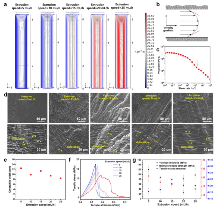 图2 | CLO纤维结构和力学性能随挤出速度的变化