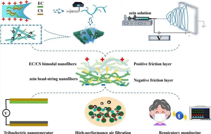 厦门大学郑高峰教授与福州大学邵尊桂副研究员团队合作,提出了一种新的宏/微协同设计策略:通过宏观结构增韧与微观引入供电子基团相结合,通过一步电纺与加热-退火工艺制备乙基纤维素(EC)/壳聚糖(CS)纳米纤维膜,其纤维结构稳定、供电子能力强,用作正摩擦层;又通过一步电纺工艺制备玉米蛋白(zein)纳米纤维膜,其含有大量珠串结构和硝基等吸电子基团,具有降低气流阻力和吸电子能力,用作负摩擦层。两者共同组成的摩擦发电空气过滤膜,除了可以实现高性能空气过滤以外,还可以对佩戴者进行实时的呼吸监测。相关研究成果发表在《Separation and Purification Technology》期刊上。
