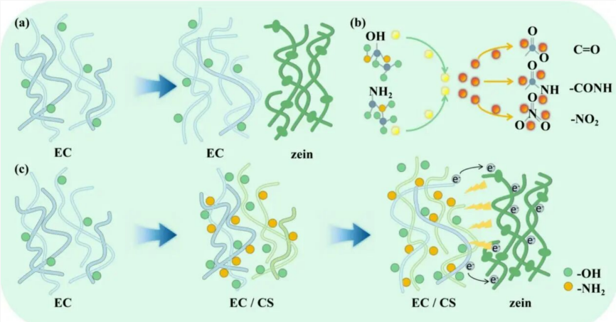 CS的加入为纳米纤维膜带来了多重优势:首先,提高了前驱体溶液电导率,增强了射流在静电场中的电压响应,使射流易于劈裂,制备双峰纤维;其次,CS与EC形成的氢键,增强了单根纤维的机械强度,而通过加热-退火处理后,CS形成键合结构,增强了纤维膜的整体结构稳定性,二者协同改善了纤维膜的机械性能;最后,CS含有羟基、氨基等强供电子基团,显著提升了膜的供电子能力,从而增强了膜的摩擦电性能。