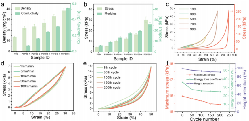 PSPBB性能表现十分突出。它密度极低,仅为33.02mg/cm³,佩戴无负担;同时拥有超强的抗疲劳性,经过200次压缩循环后,高度保持率仍超过90%,即使8000次压缩循环,传感性能依旧稳定。
