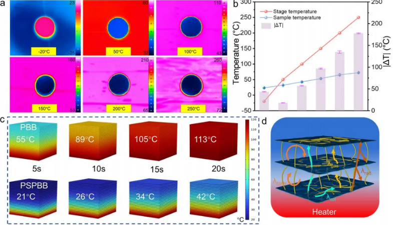 最亮眼的是PSPBB的超宽温区适应能力,可在-196℃至200℃的极端温度环境下正常工作,打破了传统传感器只能在常温下使用的局限。此外,材料内部独特的平行片层多孔结构,赋予其出色的隔热性能,热导率仅0.027W/(m·K),能有效阻隔热量传递,为人体搭建防护屏障。