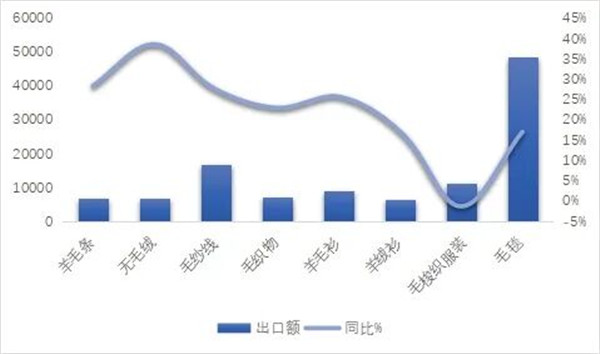 2026年1-2月毛纺主要产品出口金额与同比情况(单位:万美元,%)