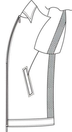 为设计运动适配结构,在夹克腋下的前衣身片和袖底衣片拼接宽度为 5 cm的针织羊毛面料。该针织面料弹性优良,与主体面料颜色相同、质地相近,拼接处隐藏于腋下,既满足手臂大幅运动需求,又不影响外观效果。
