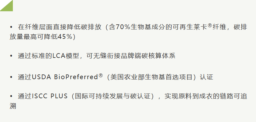 而莱卡公司新推出的可再生莱卡®纤维则提供了一种“可量化、可验证”的减碳路径: