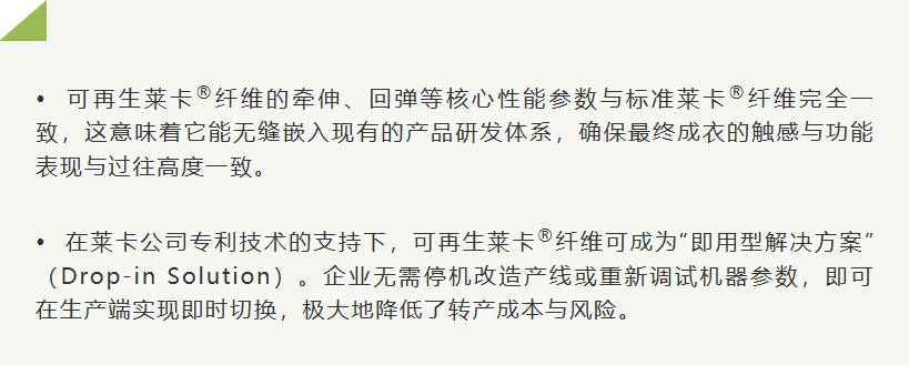 可再生莱卡®纤维所代表的正是这种新材料范式:以材料创新为起点,重构产品、供应链与商业模式,让“低碳转型”具备了产业级、规模化、可复制的实现路径。