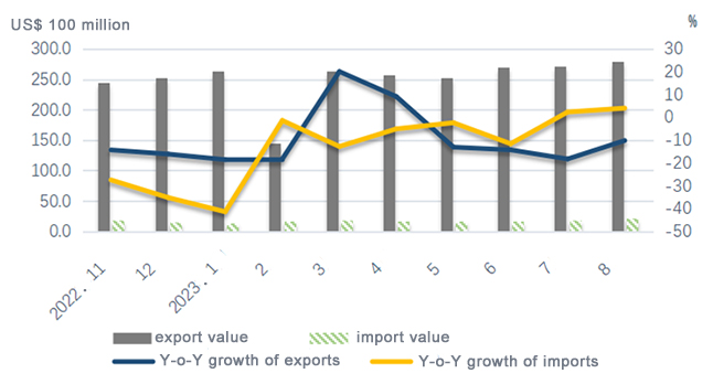 As for the destinations, the trend of the global market pattern presents a rise in the East and a descend in the West in August. The exports to the European Union, and Japan both saw a more than 20% year-on-year decline. While Central Asia, West Asia, Africa and other “Belt and Road” countries remain the main driving force for growth. Thereinto, the exports to Algeria reached more than 100% year-on-year increase for four consecutive months.