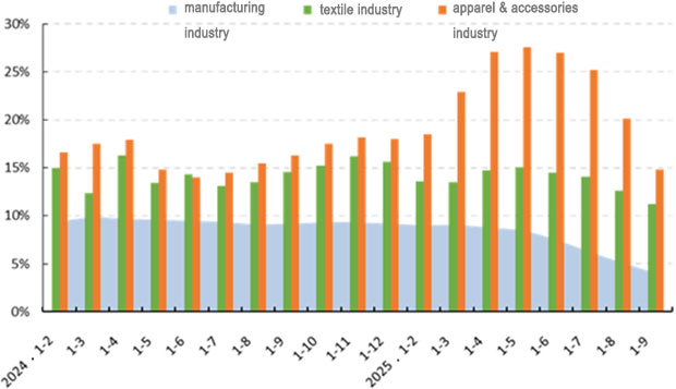 The new initiatives announced aim to boost private sector involvement in major national projects and programs, including those aligned with key national strategies. These efforts focus on enhancing security capacity in critical areas and on the large-scale renewal of equipment and trade-ins of consumer goods. This year, clothing companies have accelerated their transformation toward high-end, smart, and eco-friendly development. They have increased investments in areas such as technological upgrades, brand development, and expanding sales channels. Although the growth rate of fixed-asset investment in the industry has slowed slightly, it has continued the relatively fast growth trend seen since 2024. According to data from the National Bureau of Statistics, actual investment in the apparel sector from January to September rose by 14.8% year-on-year. While this growth rate slowed by 1.5 percentage points compared to the same period in 2024, it still exceeded the growth rates in the manufacturing and textile industries by 10.8 and 3.6 percentage points, respectively.