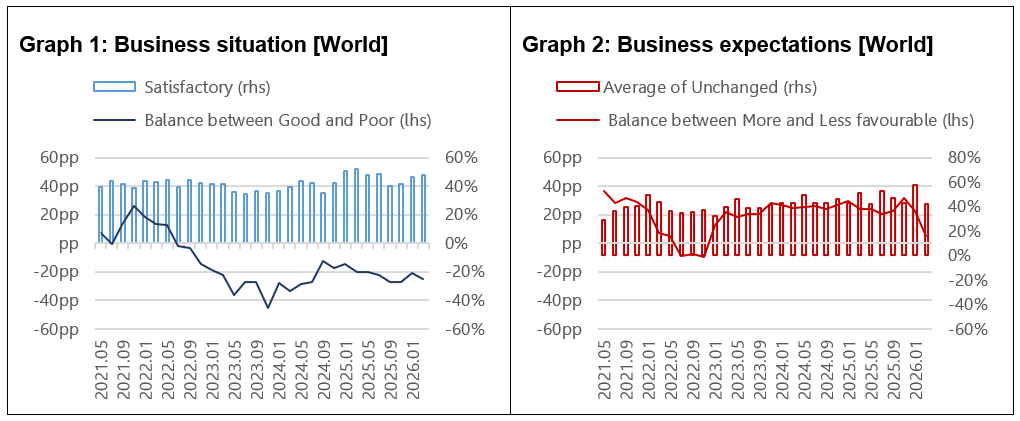 The 37th GTIS shows a deteriorating global business climate, with the global business situation balance falling to -25 percentage points as the US/Israel-Iran war disrupted energy markets. Africa was the only region posting a positive business situation and North & Central America recorded the steepest decline, while garment producers fared best among segments with textile machinery manufacturers remaining deeply negative.